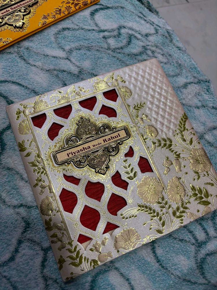 Beautiful wedding invitation card with intricate gold detailing and a personalized touch. Perfect for inviting guests to celebrate your special day. High-quality design. Ready to ship.
