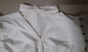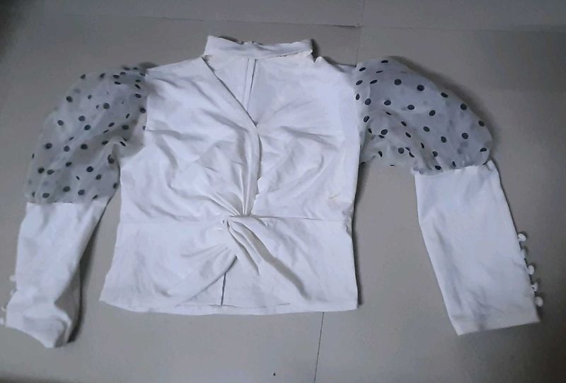 - White color with V-neck and chain detail - Full sleeves with balloon sleeves and polka dot organza fabric overlay - Cropped length with fold/twisted pattern at the waist - Belt detail at the neck adds a stylish touch - Perfect for casual outings, work, or special occasions
