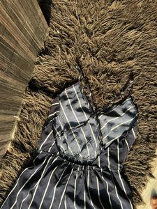 • Color: Navy Blue with White Stripes • Design: Sleeveless playsuit with a deep V-neckline, thin adjustable straps, and a cinched waist with a tie detail • Fit: Relaxed fit through the shorts, with a flattering cinched waist for a defined silhouette • Condition: Gently used, in excellent condition with no stains or tears • Material: Lightweight, cotton fabric, smooth and comfortable for warm weather