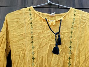 A sunny yellow tunic dress with delicate embroidery details. Features a comfortable fit, 3/4 sleeves, and a tassel tie neckline. Perfect for casual outings or dressing up with accessories. In excellent condition.