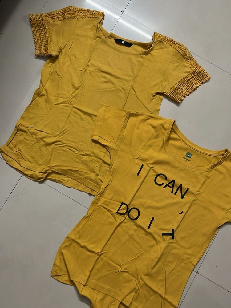 Two yellow t-shirts, one with crochet shoulder detail and the other with an 'I Can Do It' graphic. Perfect for casual wear. Grab this deal!