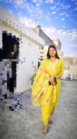 Elegant yellow kurta set, perfect for festive occasions. The set includes a kurta, bottom, and dupatta. The fabric is comfortable and breathable, making it ideal for long hours of wear. Dress it up with jewelry for a wedding or keep it simple for a party.