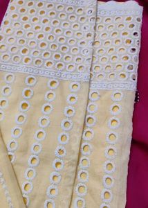 This is a light yellow color kurti with light embroidery work. Worn only once but because it was kept packed in almirah and was not opened for some time which is why it has a stain on front as visible in image. the stain will be cleared once washed again. Else the kurti is new not gorn and no other defect.