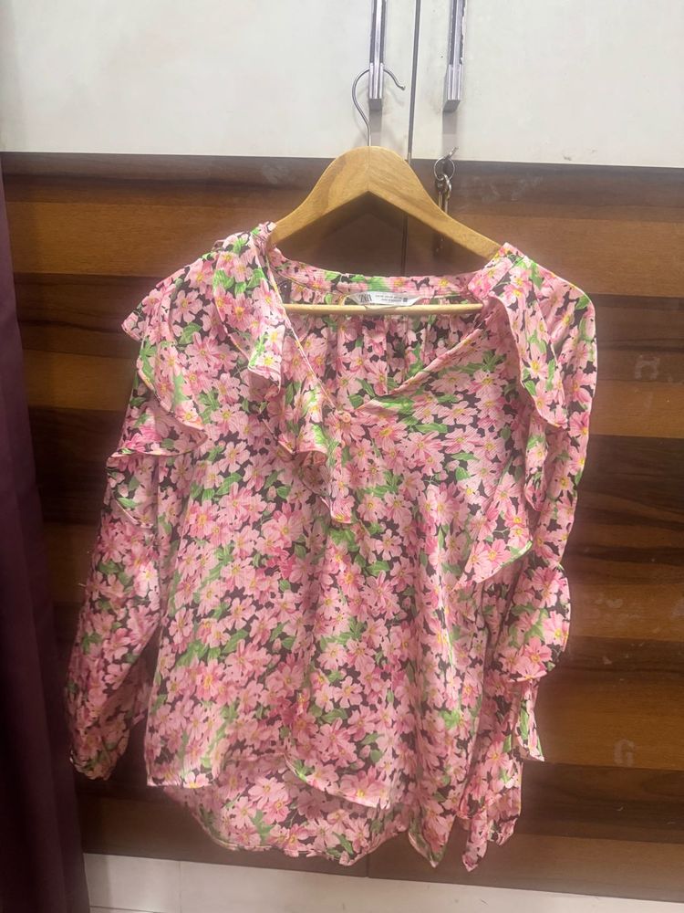 Beautiful floral print top with ruffle detailing. Perfect for a casual day out or a brunch with friends. Lightweight and comfortable fabric. Add a touch of elegance to your wardrobe with this stylish top.