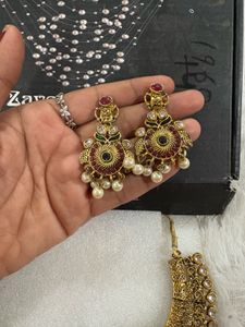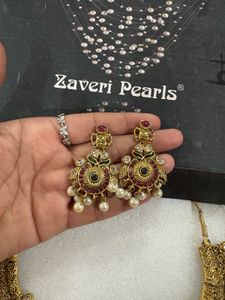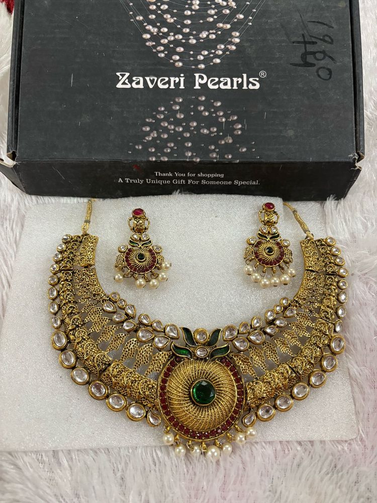 This elegant Zaveri Pearls necklace with matching earrings features intricate gold-tone detailing, sparkling stones, and pearl accents. Perfect for weddings, parties, and festive occasions, it adds a regal charm to your look.