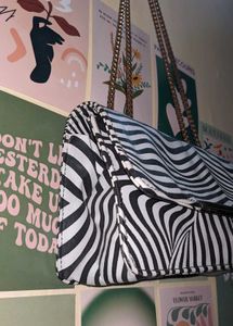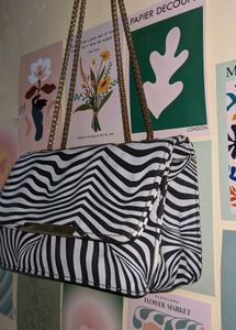 black & white zebra print sling bag with gold chain straps! Perfect for adding a bold touch to your outfit.