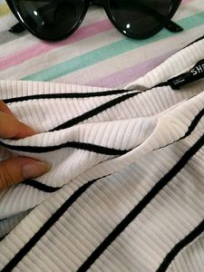 Extremely good thick quality. Ribbed. Feels like thin wool. Off shoulder or boatneck. Stretchy. XS
