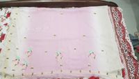 it is an silk fabric saree it is very pretty and in pink colour with beautiful flowers it is party wear and in new condition it has many beautiful gems it colour is very nice
